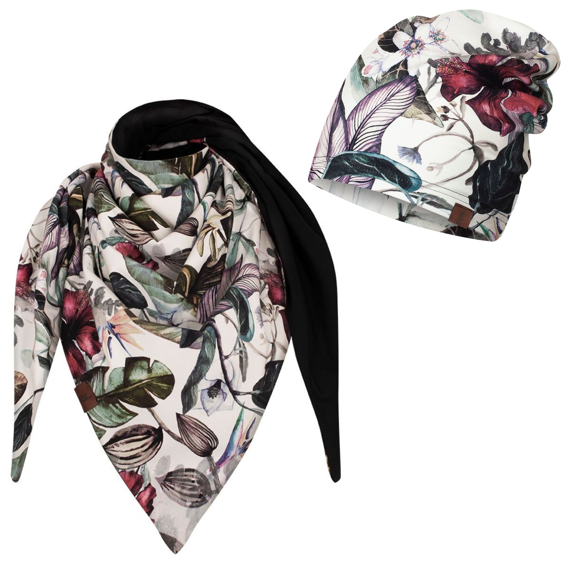 Komplet cienka czapka + chusta, hawajskie kwiaty-czarny