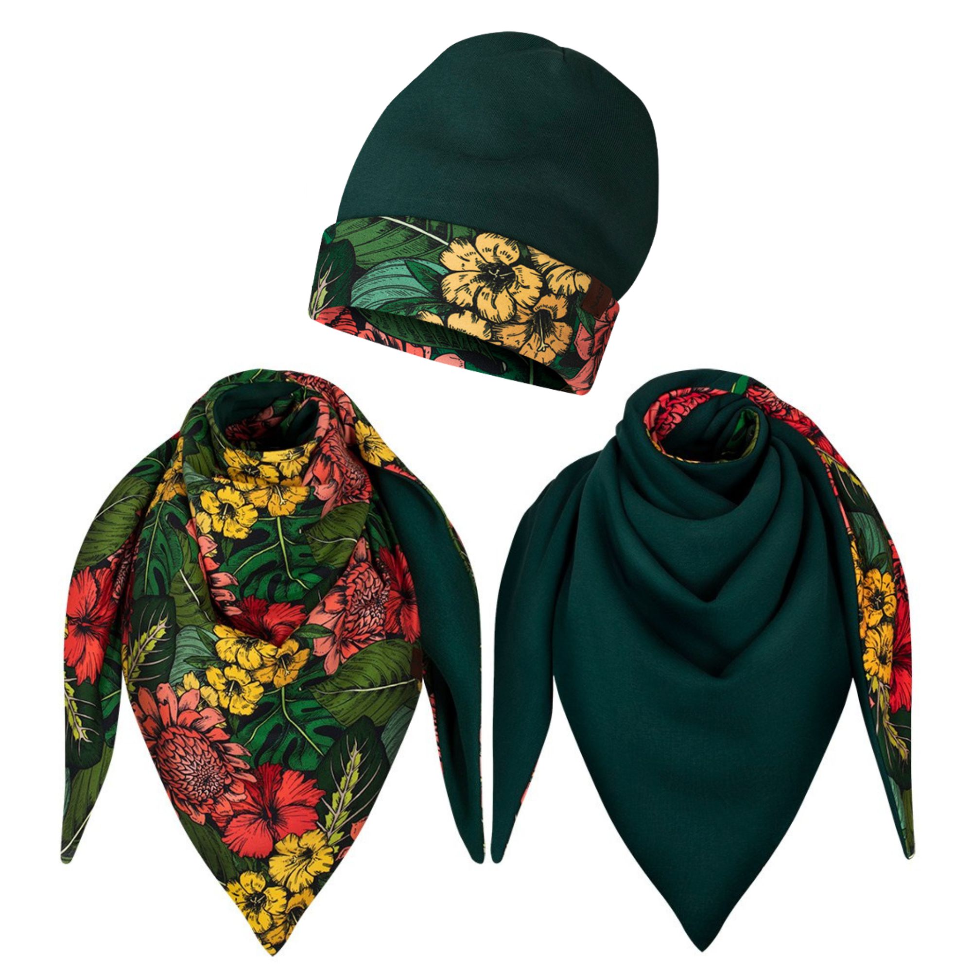 Komplet gruba chusta+czapka dalia-butelkowy zielony