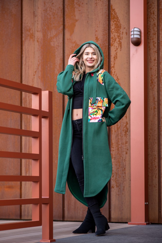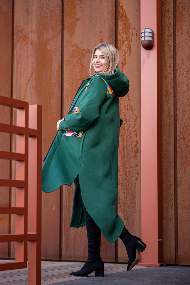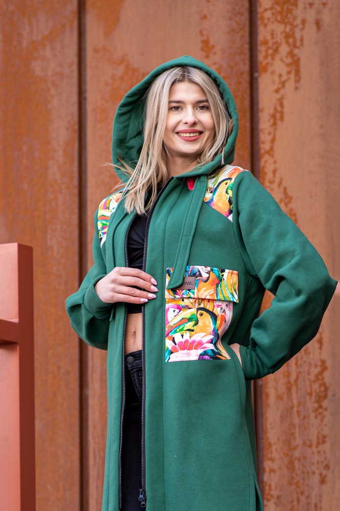 Bluzopłaszcz z kapturem a’la koszula butelkowa zieleń-papugi