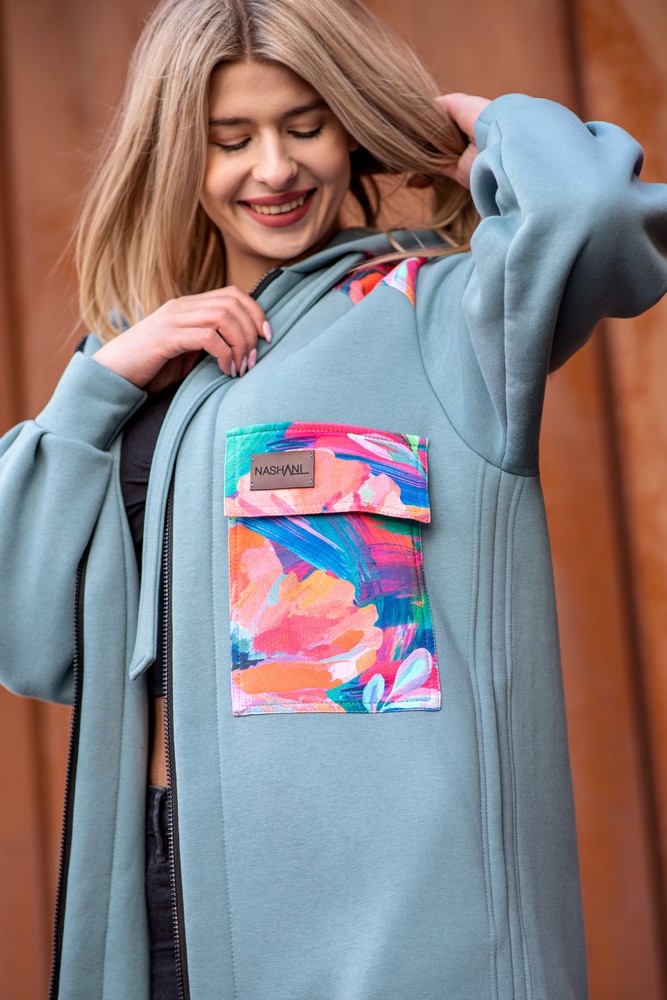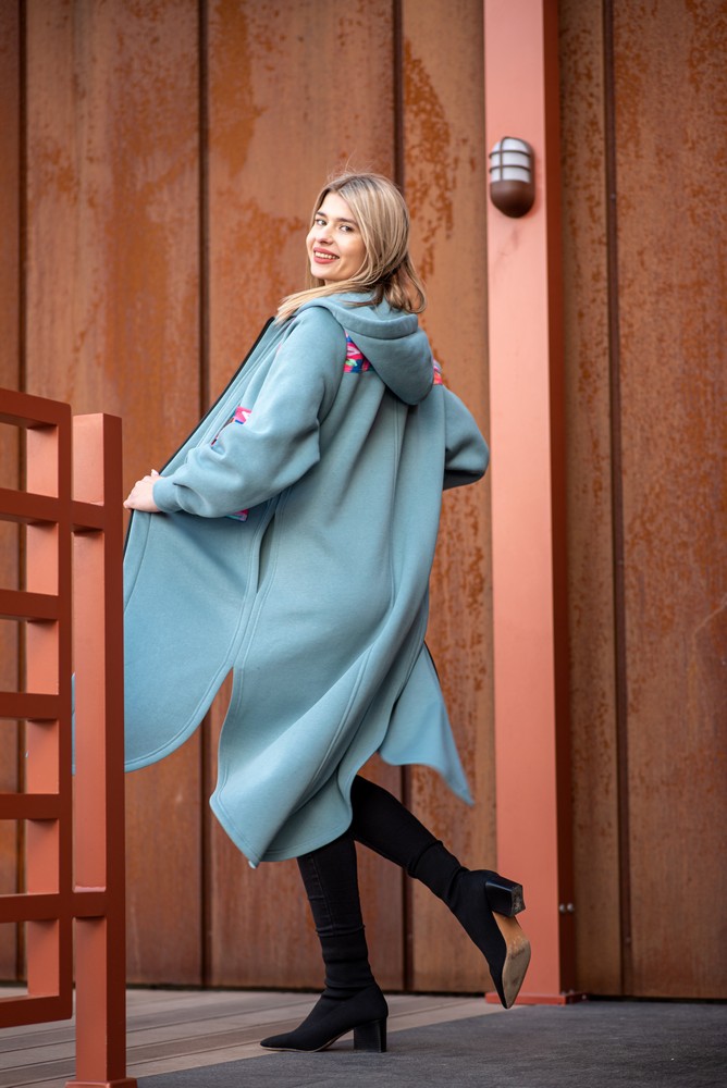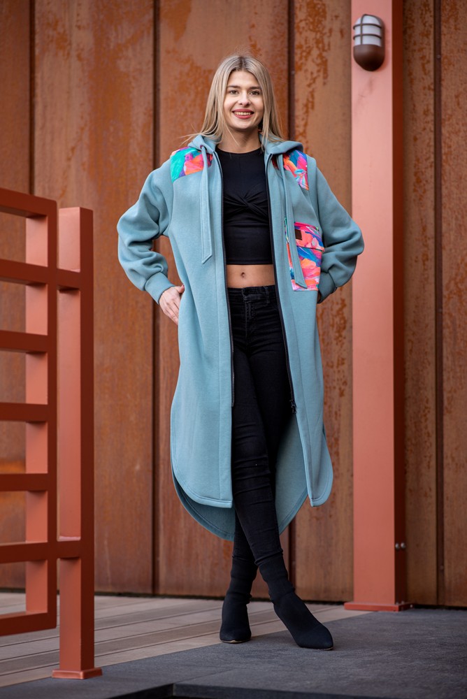 Długi wiosenny płaszcz dzianinowy z zaokrąglonym dołem. Przypominając długą sportową koszulę wygląda bardzo nieprzeciętnie i unikatowo. Łączy ze sobą klasę i wygodę. Długie rozcięcia po bokach dają pełną swobodę ruchu oraz bardzo niespotykany wygląd. Płaszcz wykończony z niezwykłą starannością, każdy szew jest jego ozdobą. Jak na płaszcz do złudzenia przypominający koszulę przystało, posiada naszytą dużą kieszeń z  barwnego printu. Zastosowanie ekspresyjnych wzorów ożywia bluzę i przyciąga spojrzenia. Nietypowy jest również ozdobny szeroki sznurek w kapturze. Wykonany z precyzją z tej samej dzianiny co cały płaszcz. Projekt jest bardzo nieszablonowy.