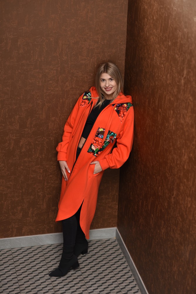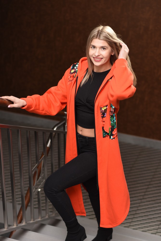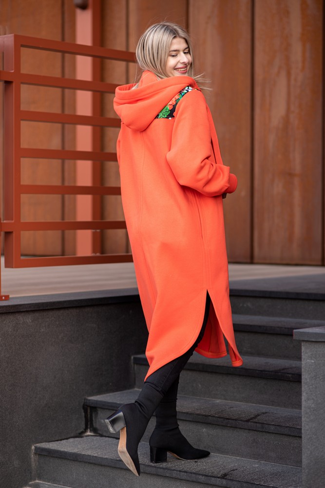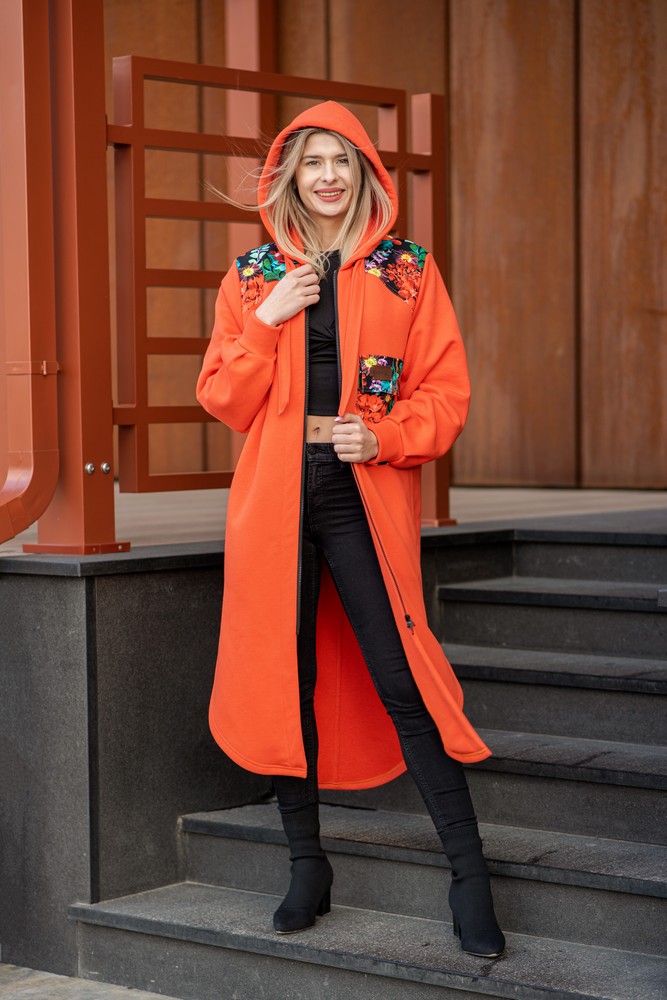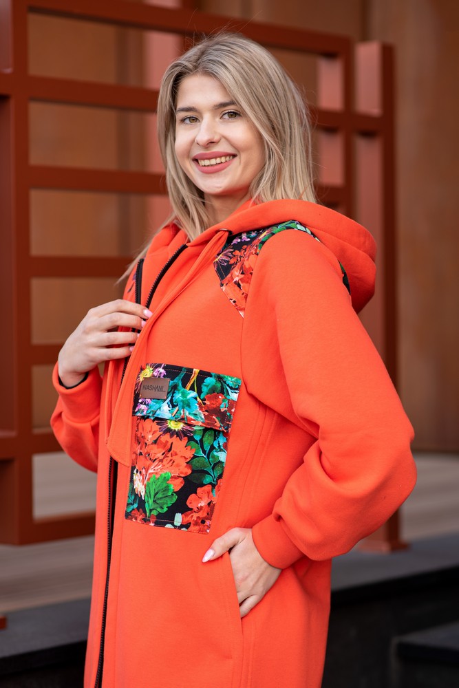 Bluzopłaszcz z kapturem a’la koszula pomarańczowy-czerwone kwiaty