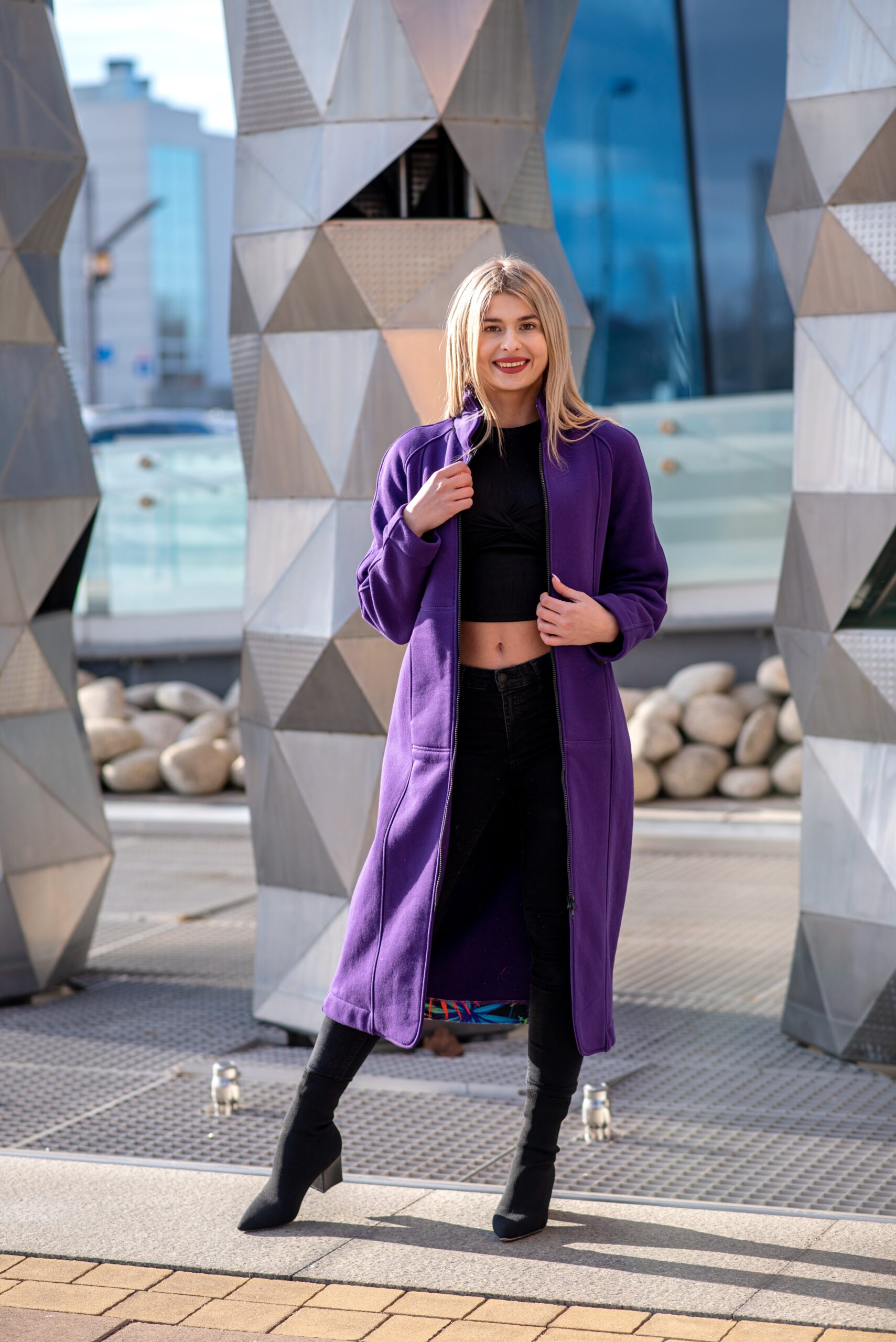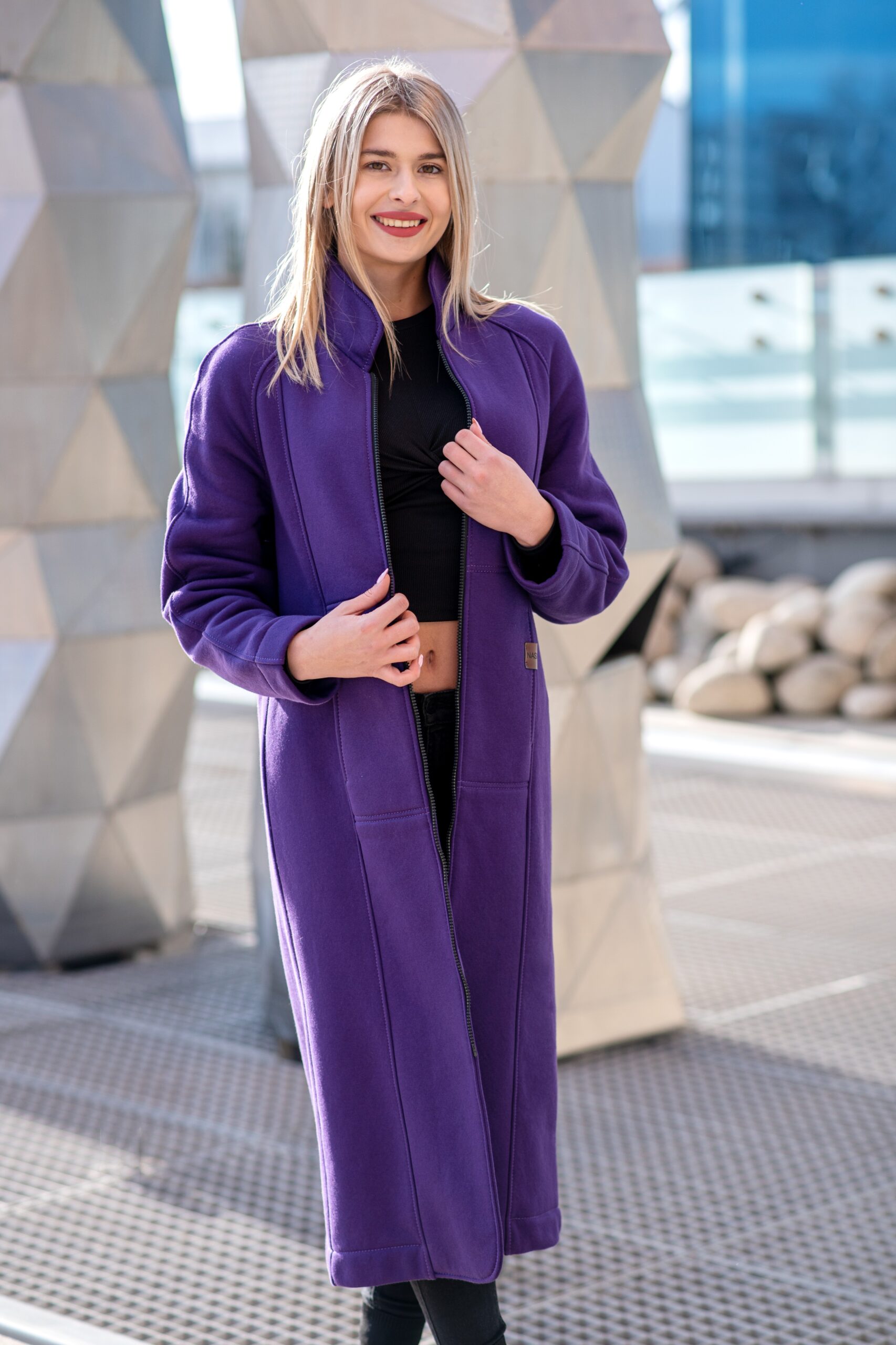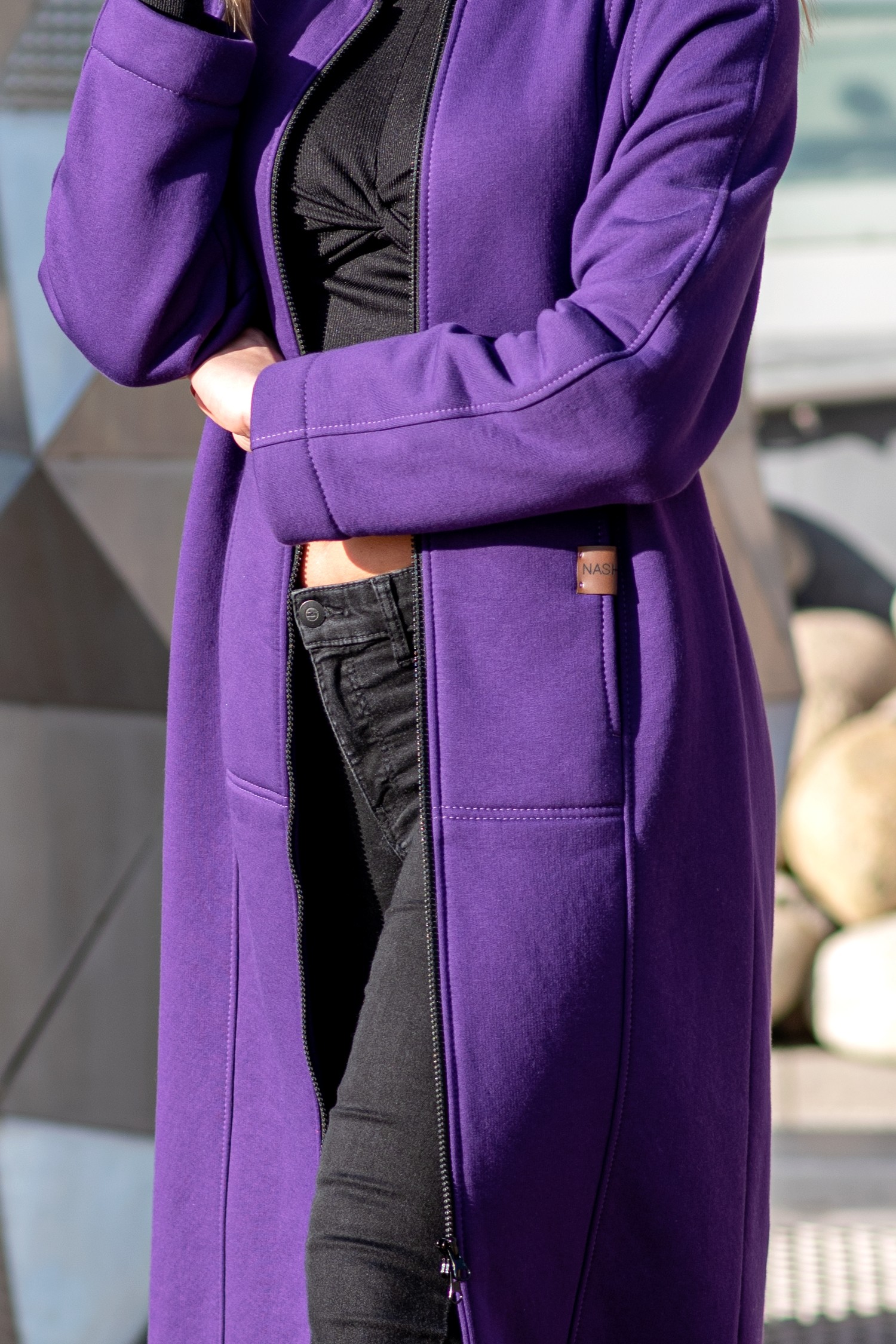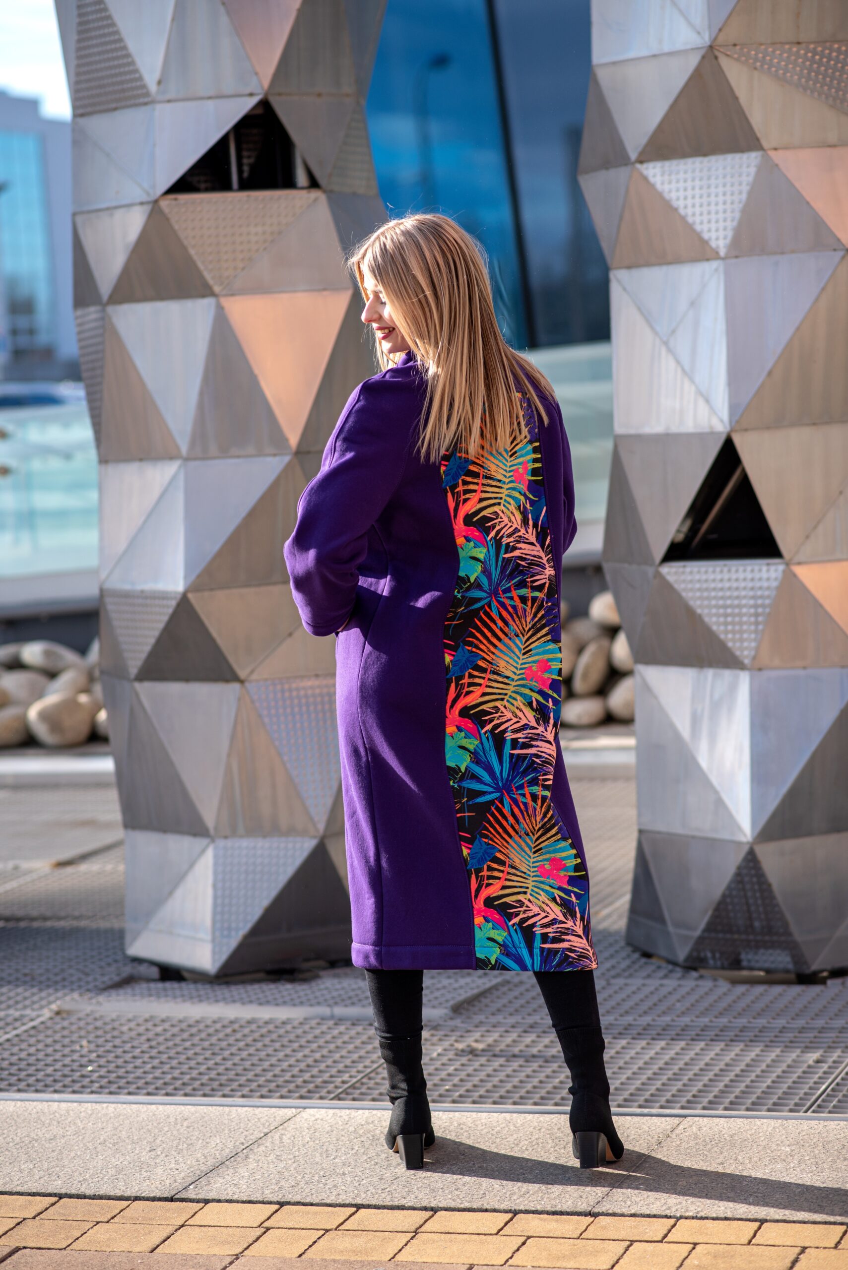 Długa dzianinowa bluza ze stójką fiolet-neonowe liście