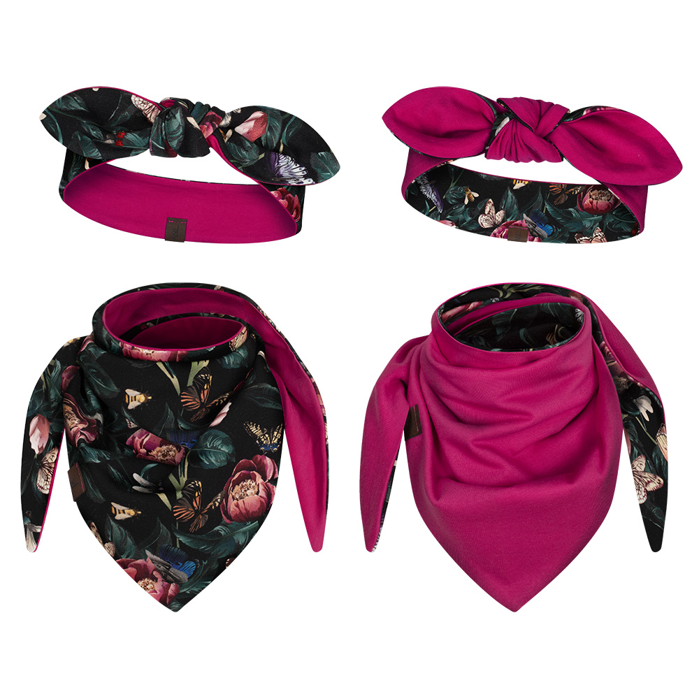 komplet dwustronny dziecięcy opaska z kokardką i apaszka, Francja-malina