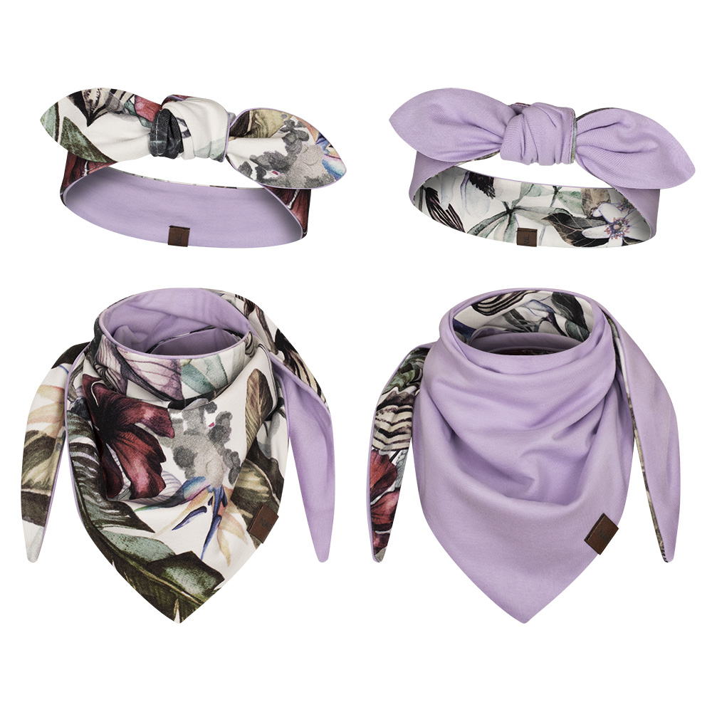 komplet dwustronny dziecięcy opaska z kokardką i apaszka hawajskie kwiaty-lila