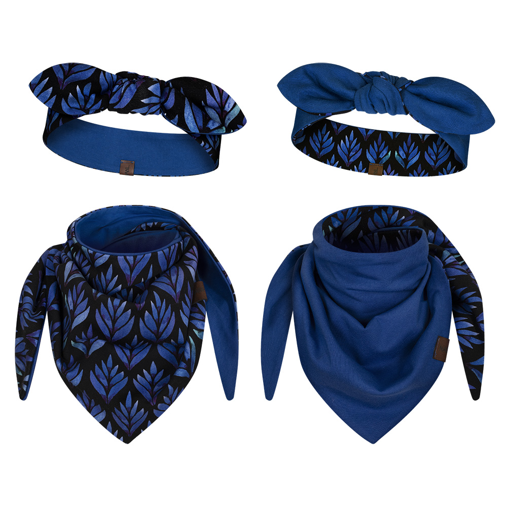 komplet dwustronny dziecięcy opaska z kokardką i apaszka, kobaltowe liście-kobalt