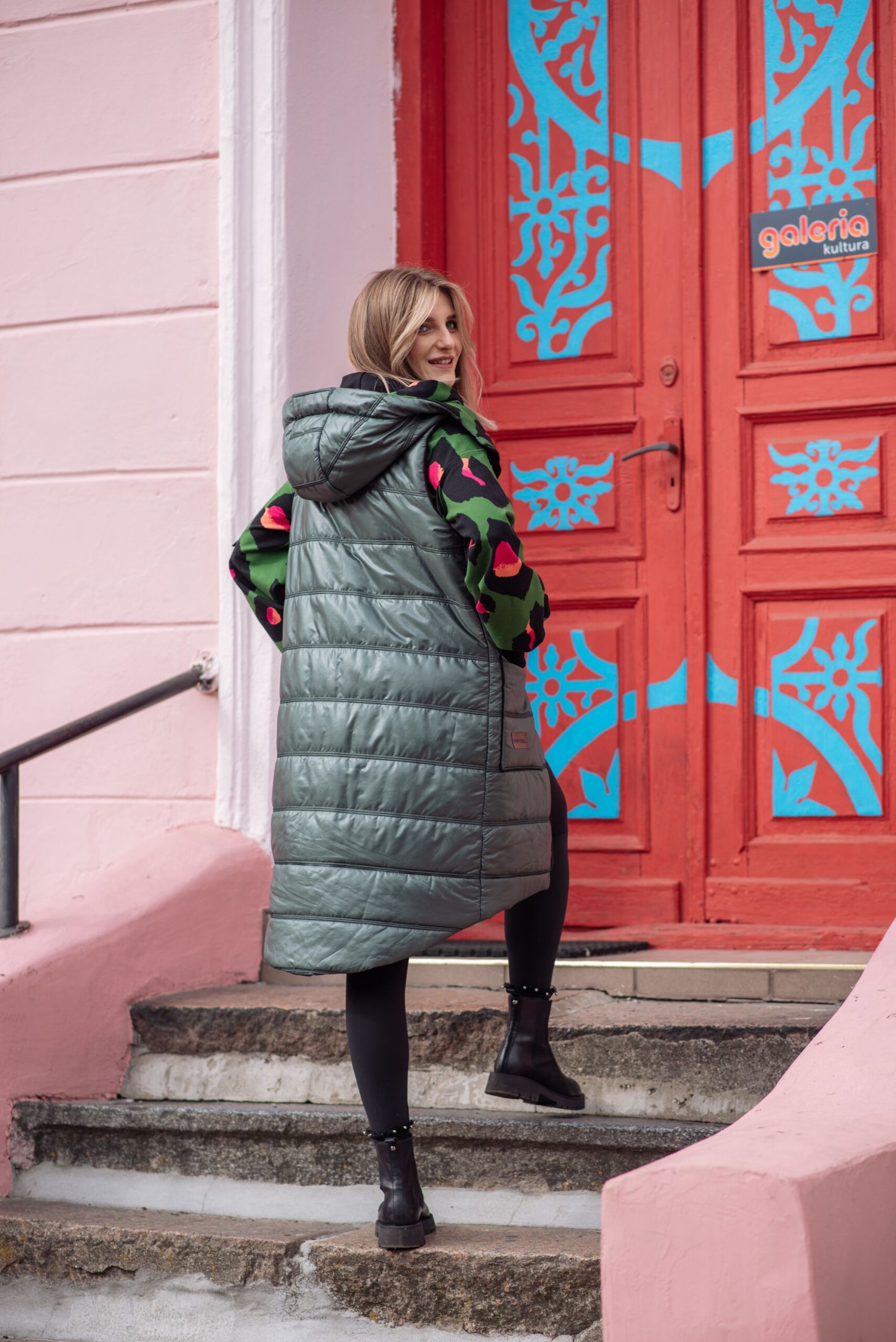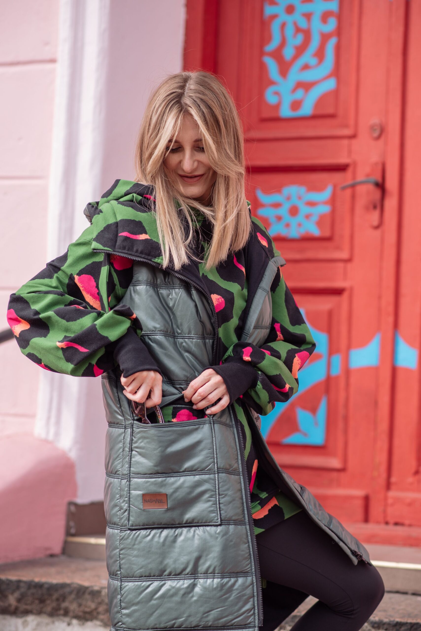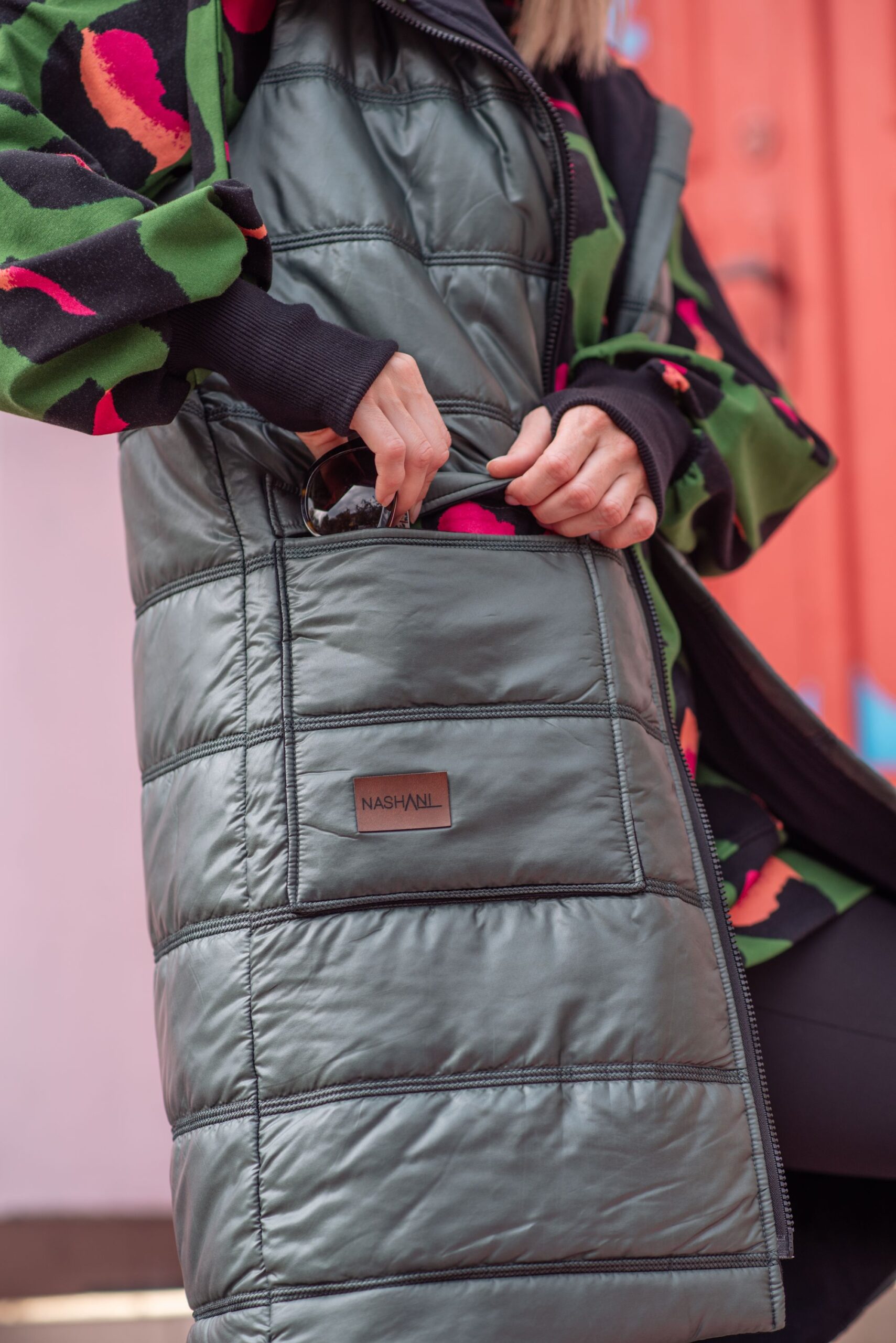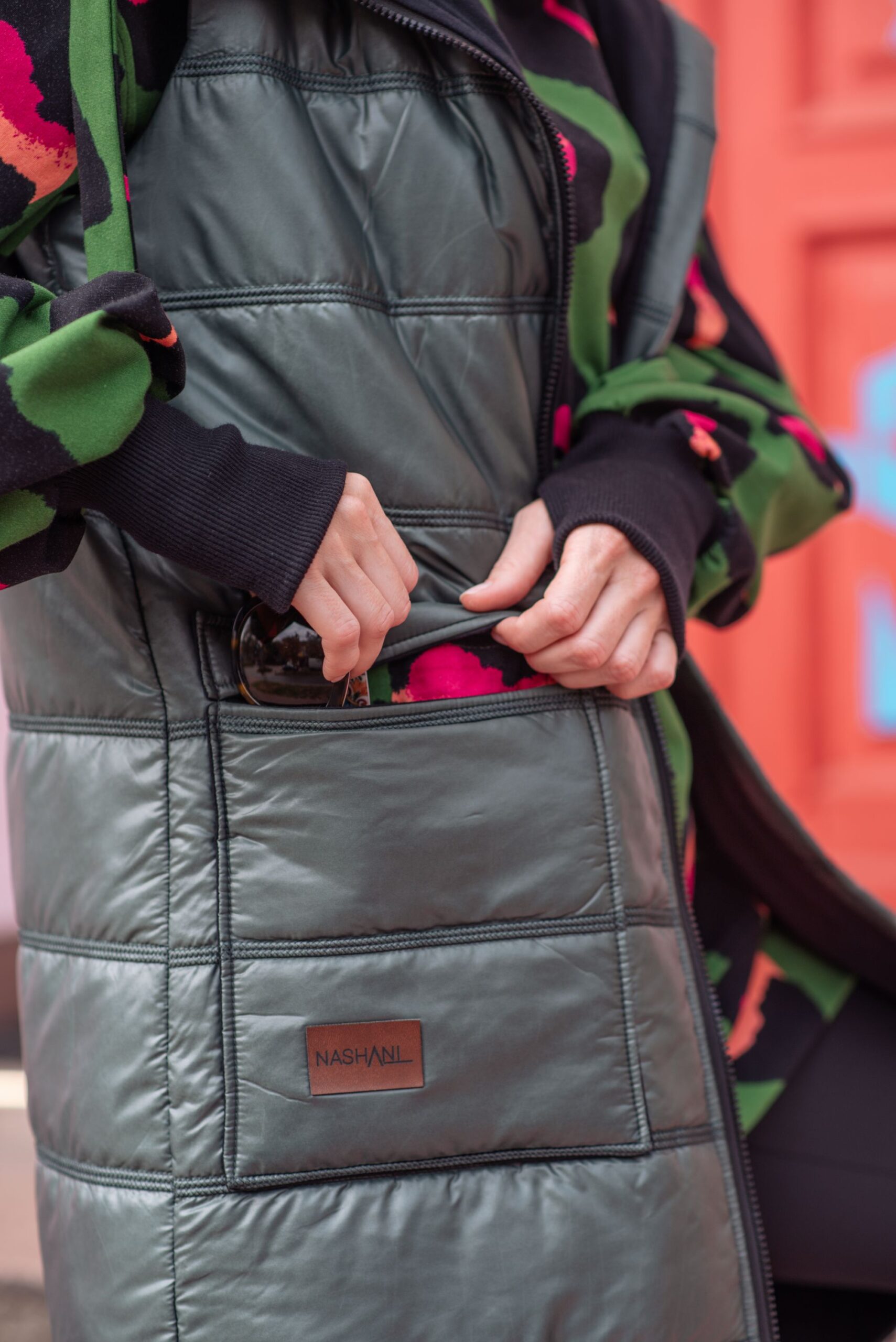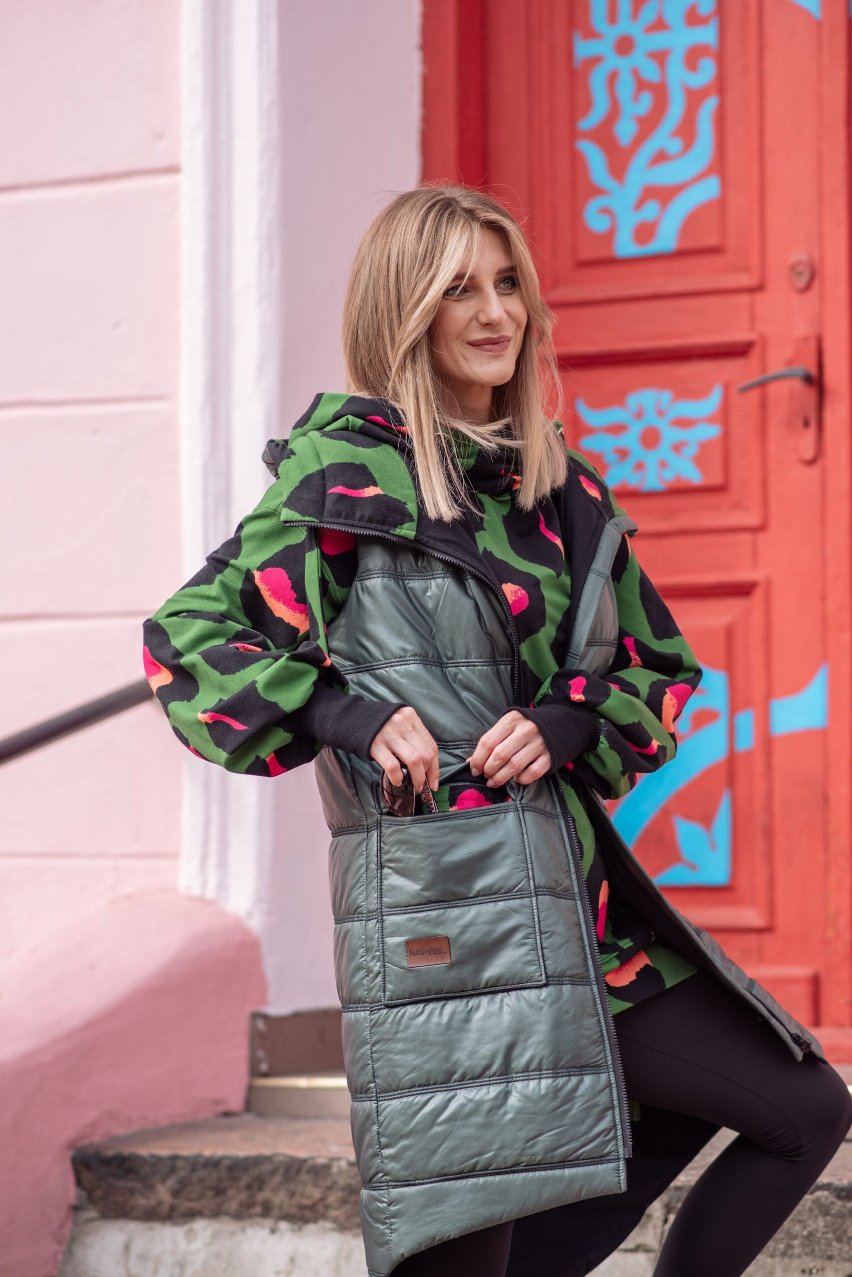 Pikowana kamizelka ocieplana idealna na chłodniejsze dni. Tkanina pumi w nietuzinkowym połączeniu z dresówką. Wnętrze kaptura, kieszeni oraz taśma ściągająca kaptur w pięknym kolorowym princie.