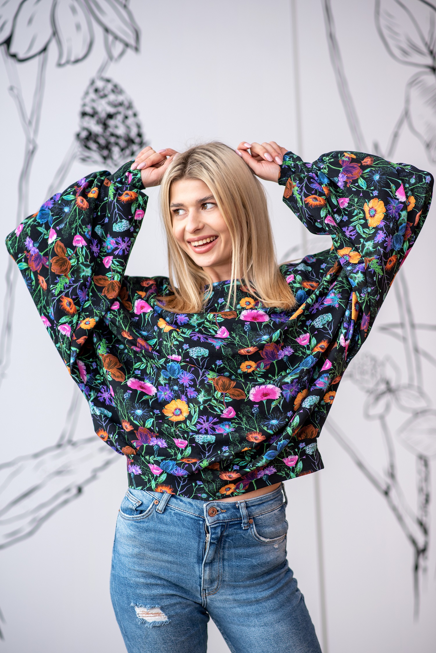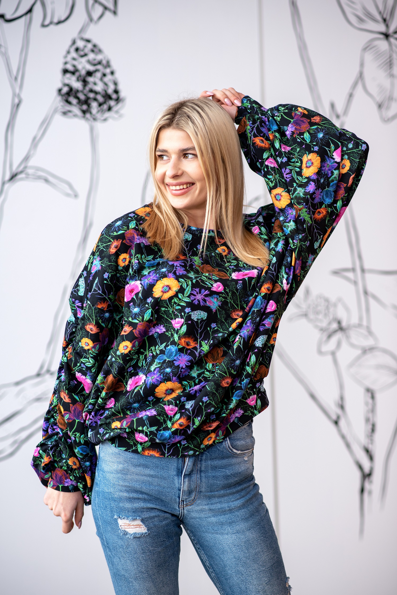 Bluzka z szerokimi rękawami w pięknych printach.Rękaw po długości od strony zewnętrznej przeszyty gumką, co daje piękny efekt puszystości rękawa.