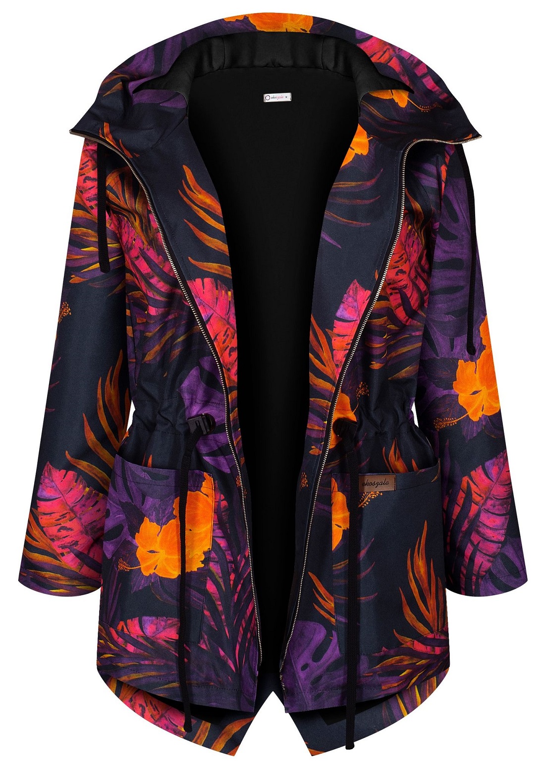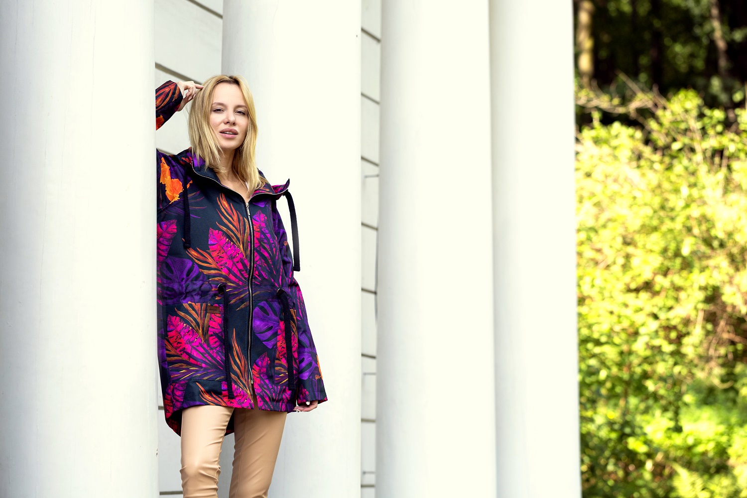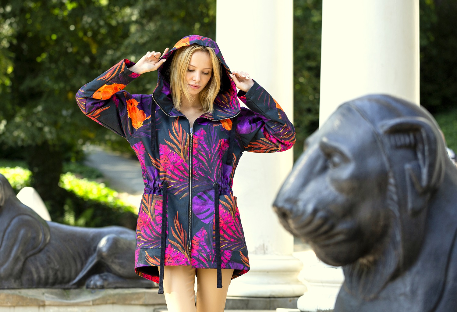 Kurtka- parka z kapturem i dużymi kieszeniami. W pasie wszyty tunel który można ściągnąć dla lepszego ocieplenia. Płaszcz ocieplony, zastosowana podszewka to dzianina dresowa drapana w stu procentach bawełniana, oddychająca. Przepiękny print przykuwający uwagę.
