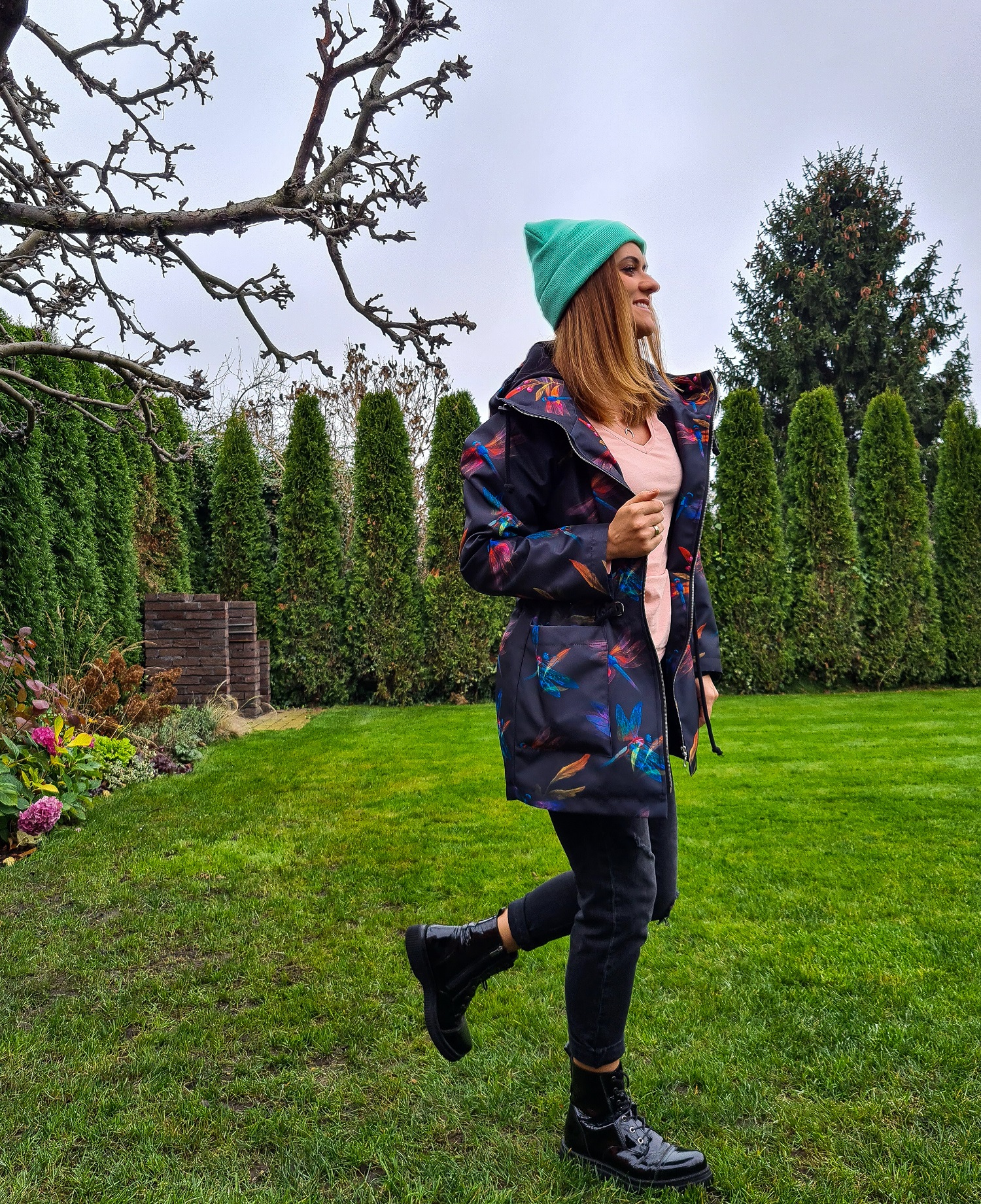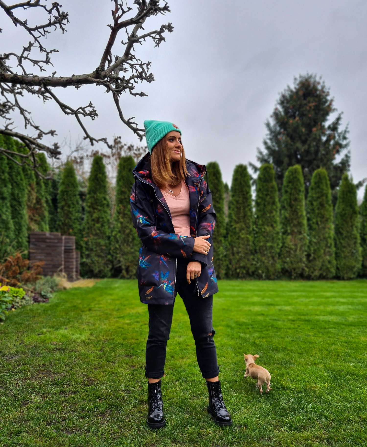 Kurtka parka z kapturem i dużymi kieszeniami. W pasie wszyty tunel który można ściągnąć dla lepszego ocieplenia. Płaszcz ocieplony, zastosowana podszewka to dzianina dresowa drapana w stu procentach bawełniana, oddychająca. Przepiękny print przykuwający uwagę.