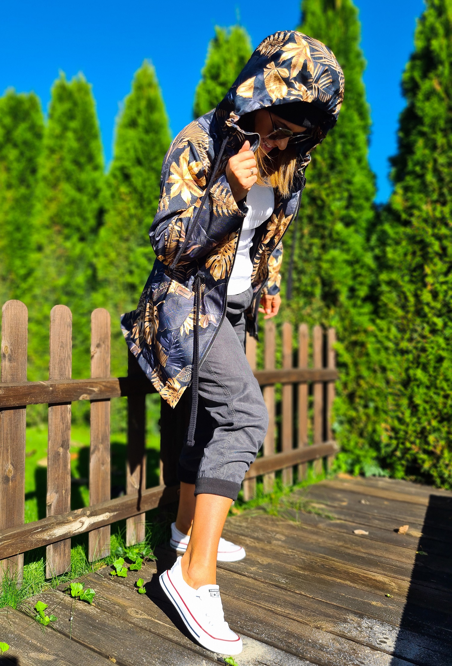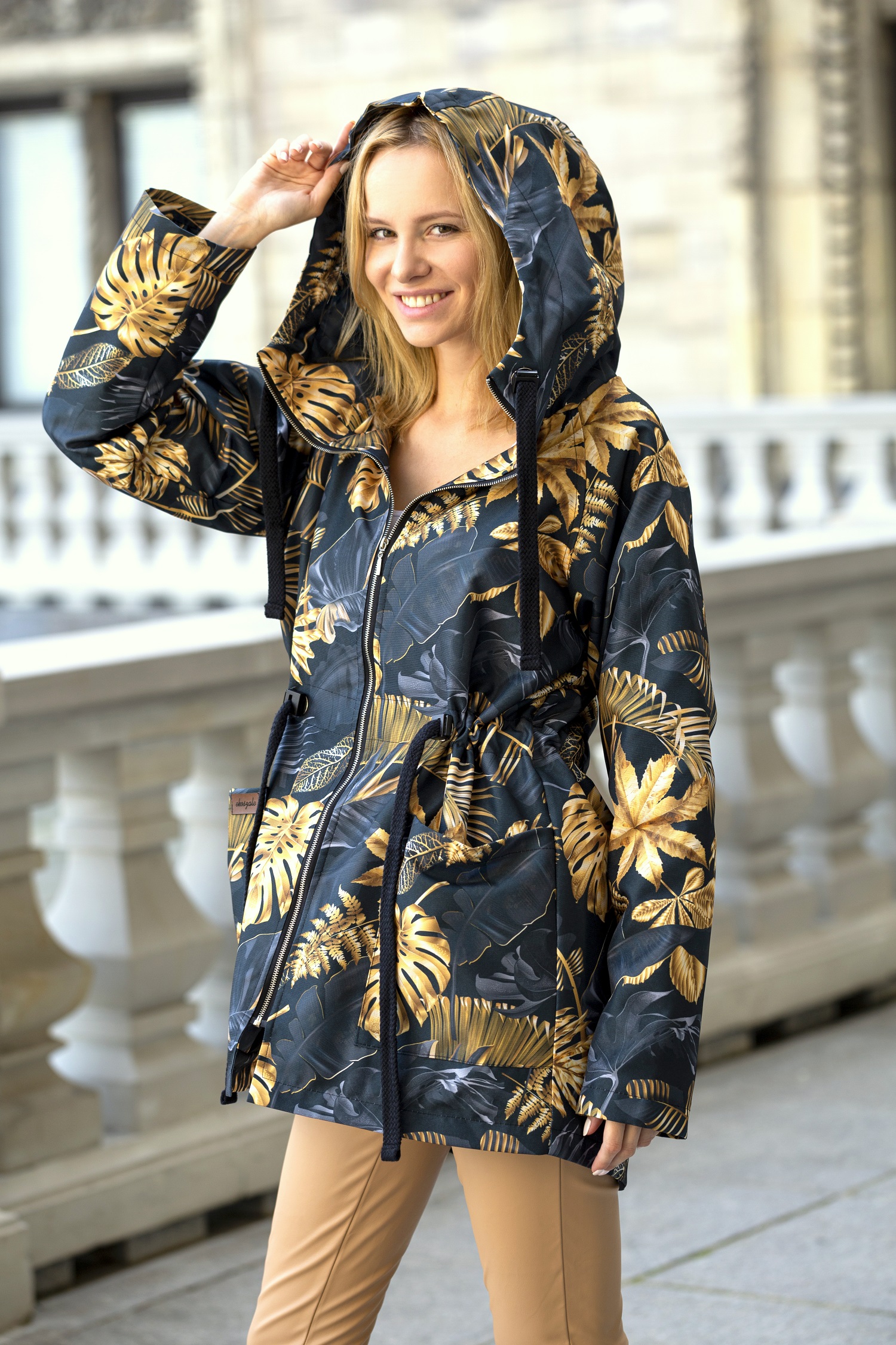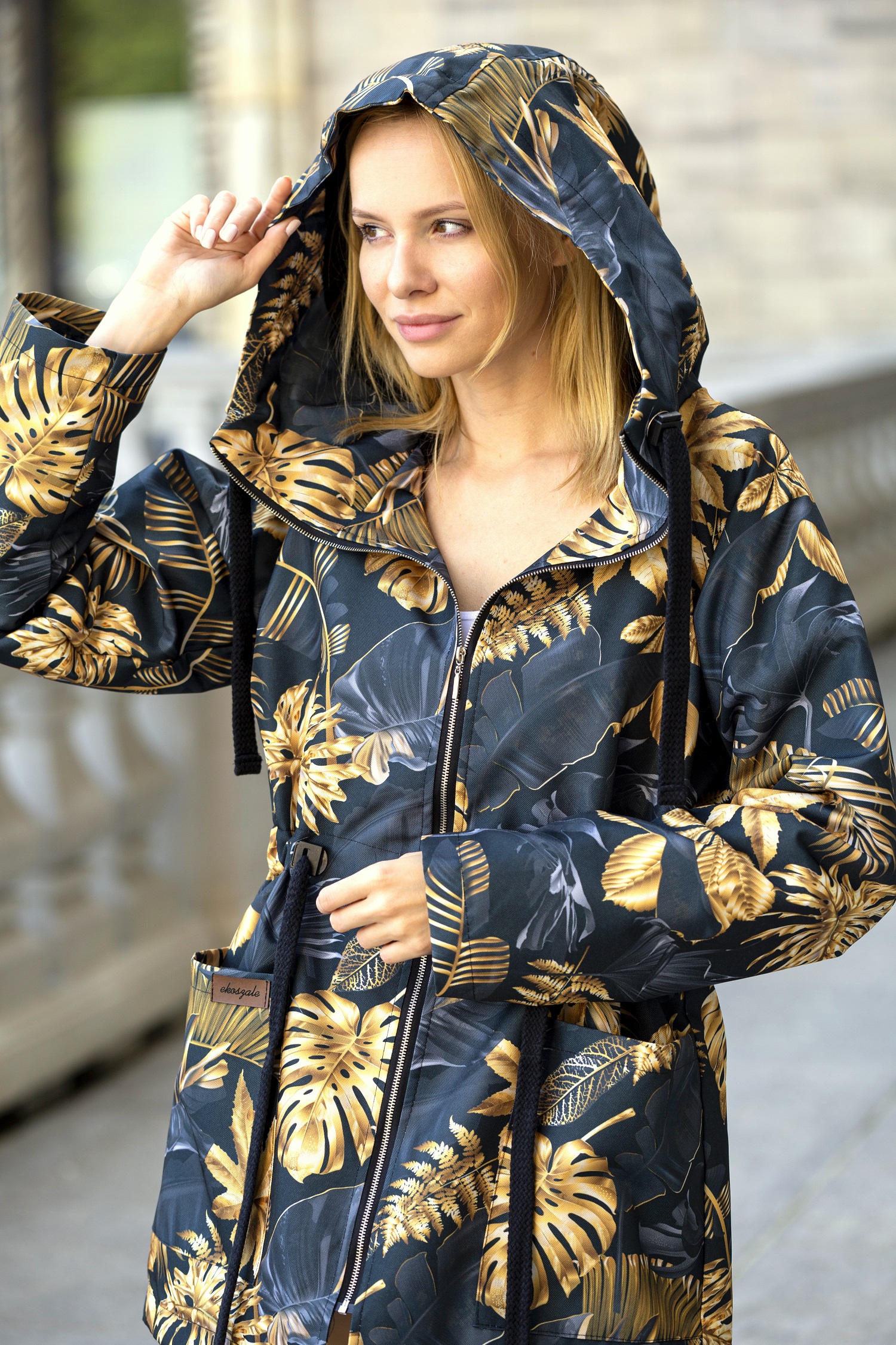 Kurtka- parka  z kapturem i dużymi kieszeniami. W pasie wszyty tunel który można ściągnąć dla lepszego ocieplenia. Płaszcz ocieplony, zastosowana podszewka to dzianina dresowa drapana w stu procentach bawełniana, oddychająca. Przepiękny print przykuwający uwagę.