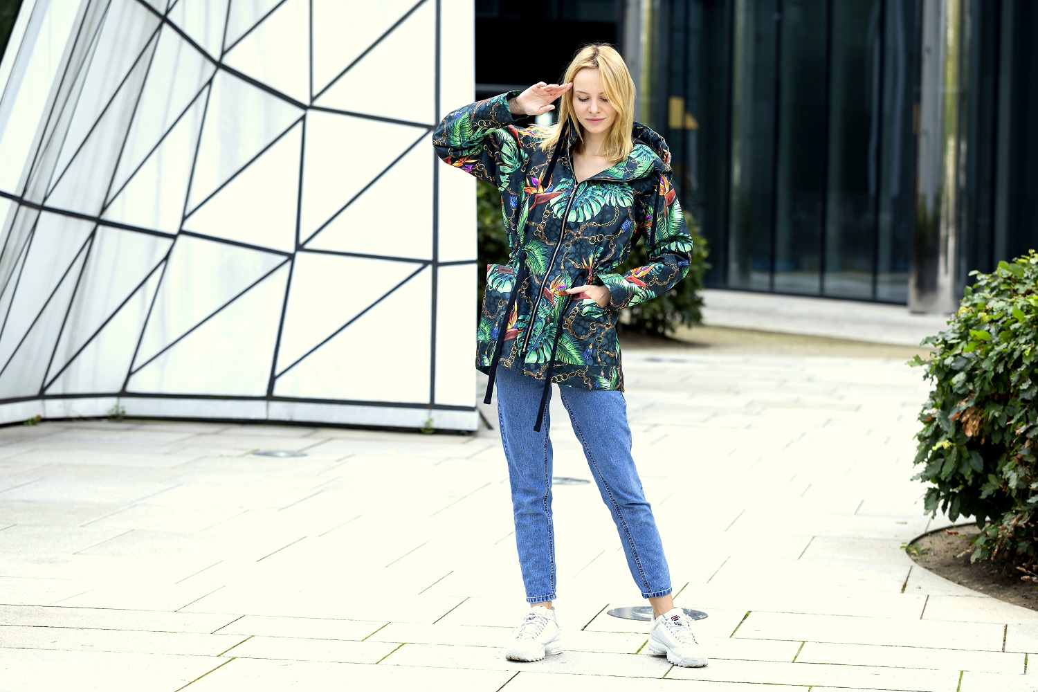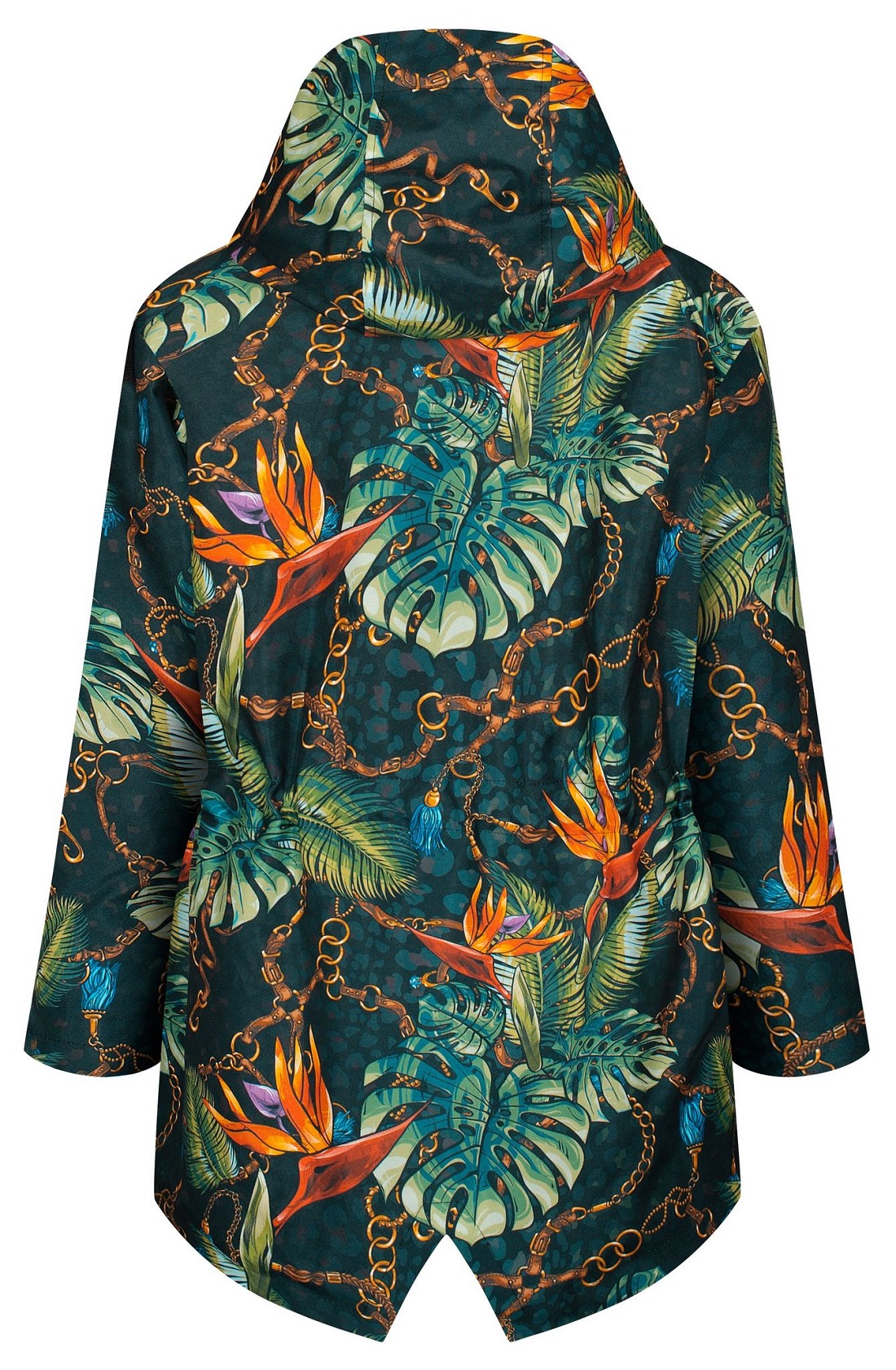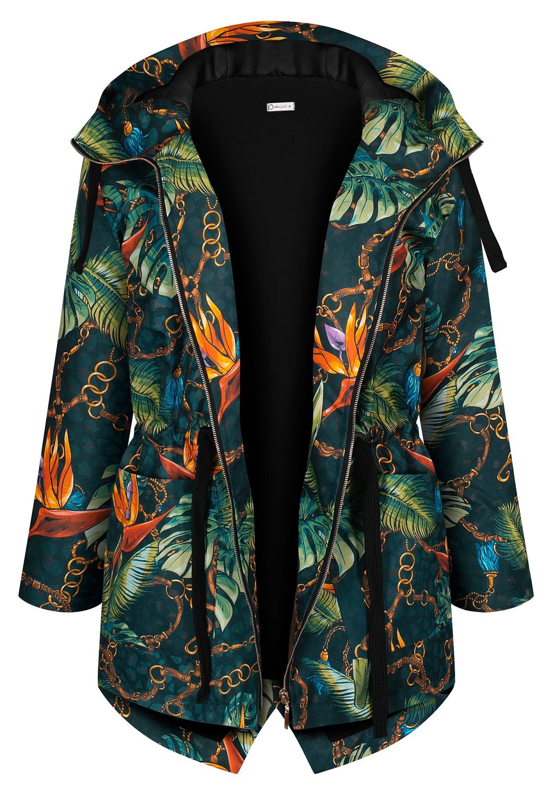 Kurtka parka z kapturem i dużymi kieszeniami. W pasie wszyty tunel który można ściągnąć dla lepszego ocieplenia. Płaszcz ocieplony, zastosowana podszewka to dzianina dresowa drapana w stu procentach bawełniana, oddychająca. Przepiękny print przykuwający uwagę.
