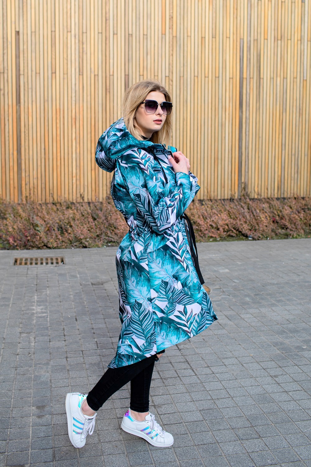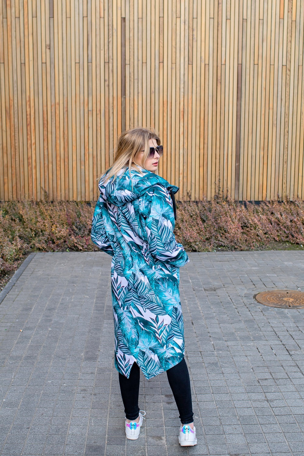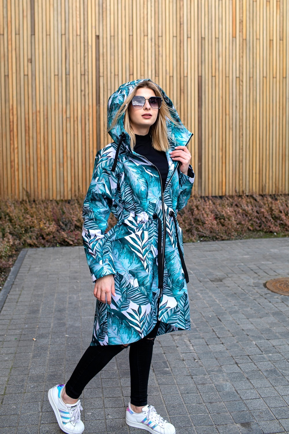 Parka z przedłużonym tyłem w turkusowe liście
