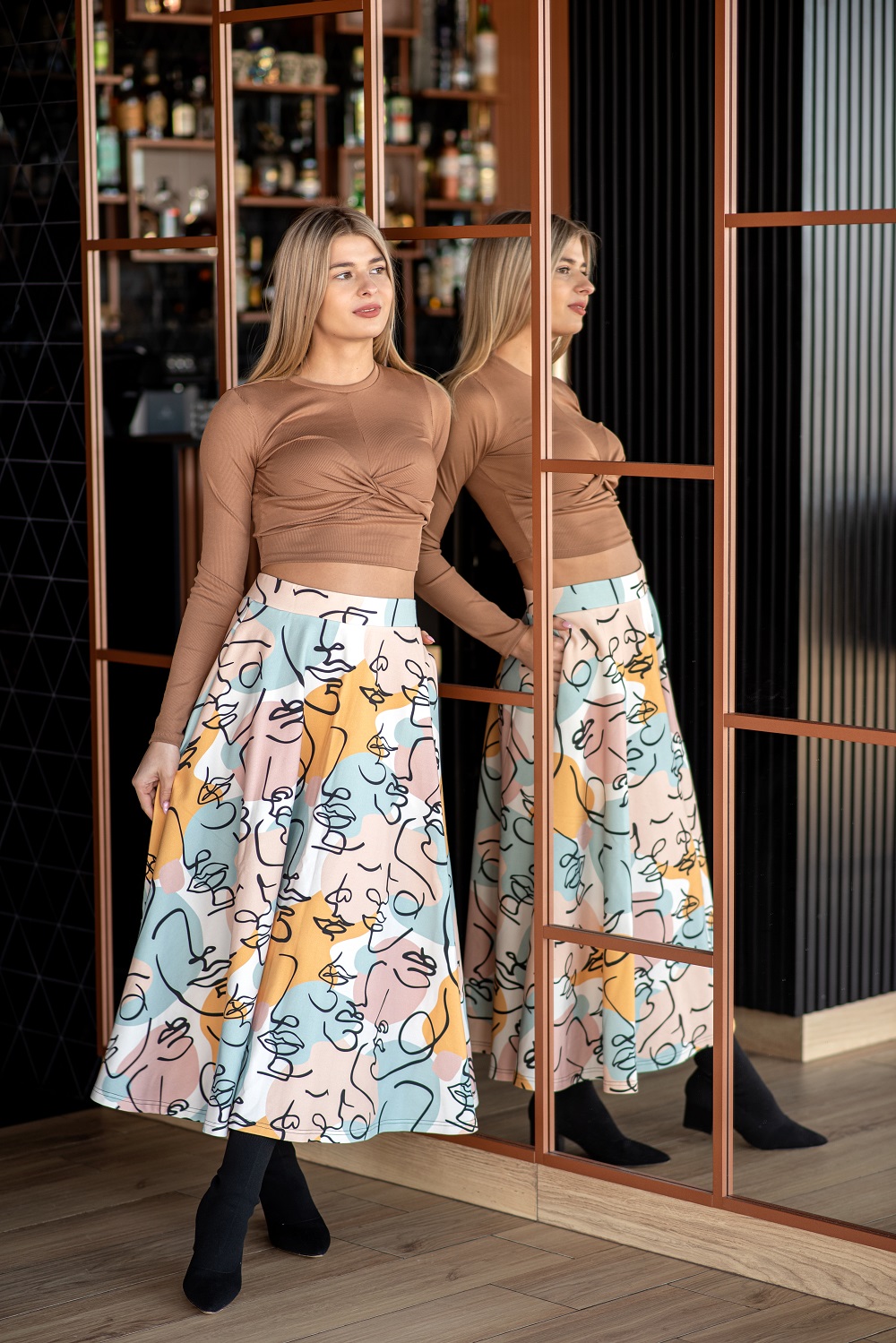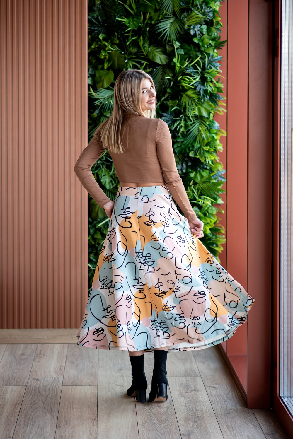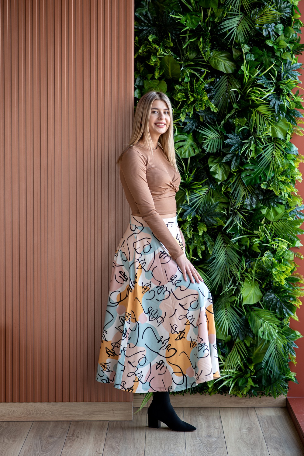 Piękna  spódnica Flora. Krój z koła nadaje jej lekkości i wyrazistego wyglądu. Do tego piękny roślinny print, ożywi każdą stylizację. W pasie wszyta guma dla pełnej wygody.  Dwie kieszonki w szwach  na drobiazgi ????